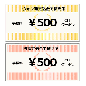 Wチャンス賞送金手数料割引クーポン 特賞の時計がはずれた人の中から抽選で20名様に当たります。 ウォン確定送金手数料500円割引クーポン券 (有効期限 2014/6/30まで) ※期間中1回のみご利用いただけます。 円指定送金手数料500円割引クーポン券 (有効期限 2014/6/30まで) ※期間中1回のみご利用いただけます。 |