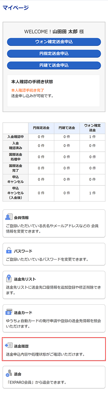 会員マイページメニューから[送金履歴照会]ボタンをクリックするとこれまでに送金申込した履歴が全件表示されます。
