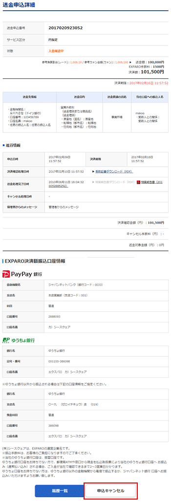 送金履歴ページのリストからキャンセルしたい送金申込番号をクリックすると、申込内容詳細が表示されます。