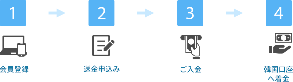 送金額を日本円でご指定いただき、優遇レートにて韓国のウォン建て口座へウォンで着金します。