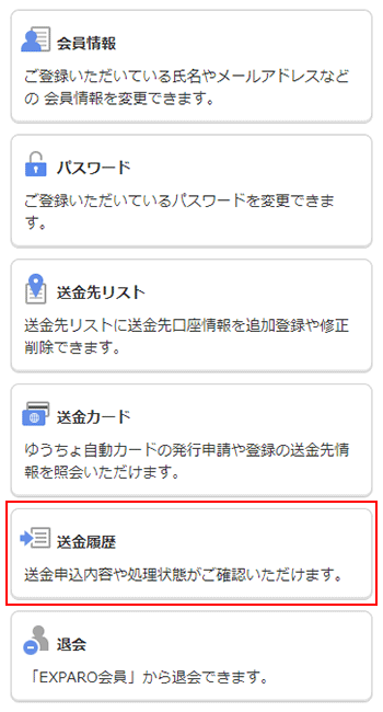 会員マイページメニューから[送金履歴照会]を選択します。