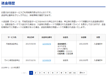 これまでに送金申込した履歴が全件表示されます。送金申込番号をクリックすると、申込内容詳細が表示されます。