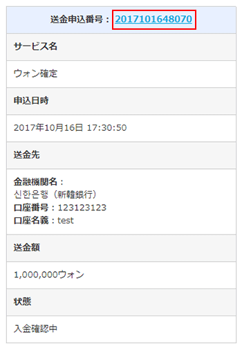 送金完了日時:申込の送金先に送金取り組みが完了した日時が表示されます。