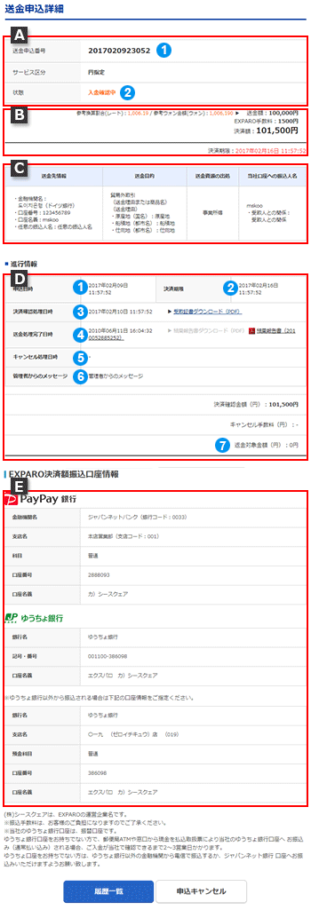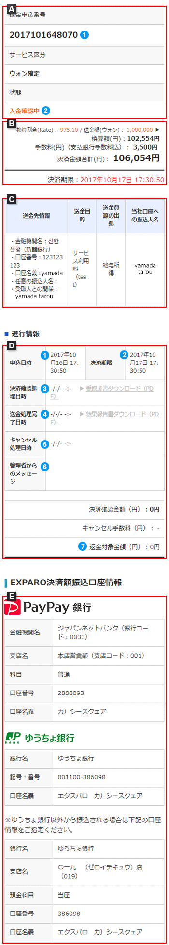送金資金をお支払いいただく国内EXPARO口座情報が表示されています。