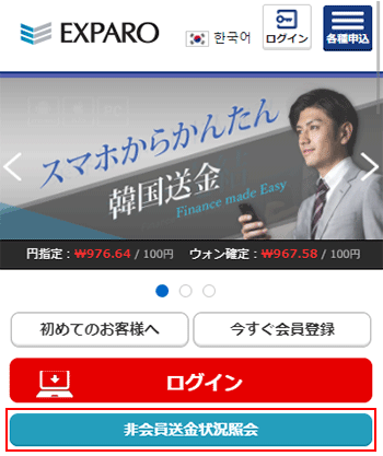 本Webサイト上部にある[ゲスト会員送金状況確認]ボタンをクリックします。