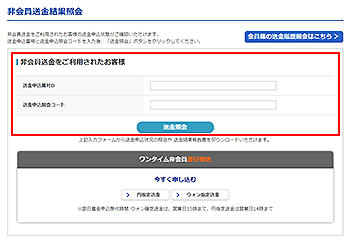 送金申込番号と送金申込照会コードをフォームに入力後、[送金照会]ボタンをクリックしてください。