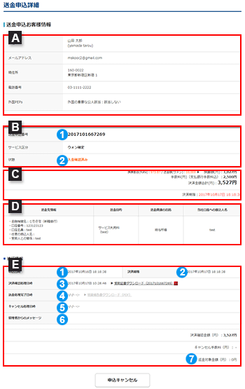 お申込時に表示された送金金額、為替レート、手数料、決済金額合計が表示されています。