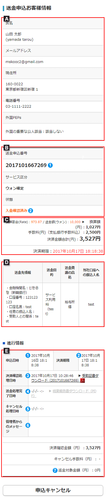 送金完了日時:申込の送金先に送金取り組みが完了した日時が表示されます。