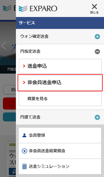 メニューボタンから[円指定送金]⇒[ゲスト会員送金申込]をクリックします。