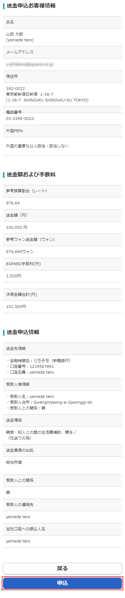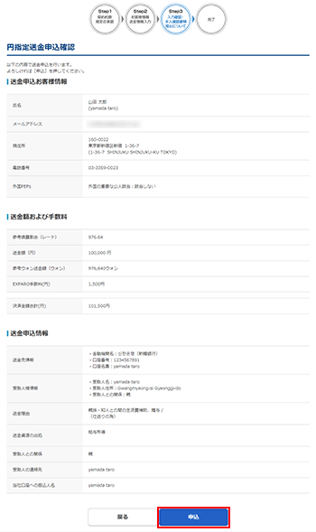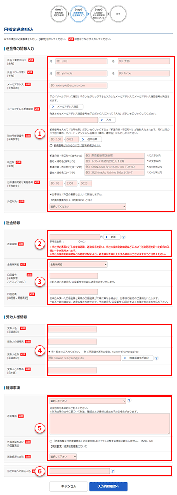 ゲスト会員円指定送金申込フォームにお客様情報、送金金額、送金先金融機関情報等を入力のうえ、申込を完了して下さい。 送金申込情報が正常に送信された場合、ご入力いただいたメールアドレス宛に送金申込確認自動メールが送信されますので必ずご確認ください。