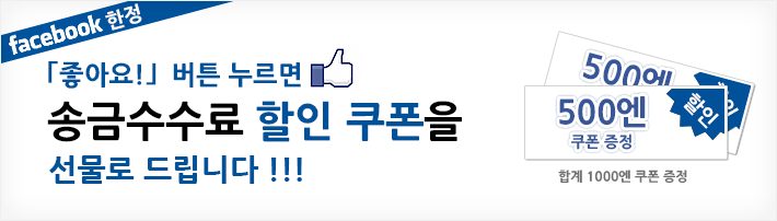 | 캠페인 참가방법 | 1. Facebook에 로그인합니다. 2. 「exparo.jp」의 Facebook에서 「좋아요!」버튼을 누릅니다. 3. 「좋아요!」캠페인 페이지에서 쿠폰을 볼 수 있습니다. 4. 송금신청정보 입력화면의 쿠폰이용란에 쿠폰코드를 입력하시고「적용」버튼을 클릭합니다. ※ EXPARO(http://exparo.com)의 회원님만 이용하실 수 있사오니, 비회원 고객님은 회원등록후에 이용해 주시기 바랍니다. ※ 이미 「좋아요!」해 주신분이나 제1탄 「좋아요」de켐페인에서 쿠폰을 이용하신 분도 다시한번 쿠폰을 이용하실 수 있습니다. |