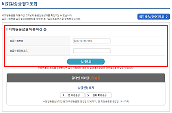 송금신청 완료 시에 표시되었던, [송금신청번호]와 [송금신청조회 코드]를 입력하셔서[송금조회]를 클릭해 주세요.