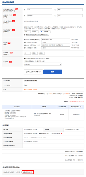 송금 불능 등에 의해 취소 처리되었을 경우, 수수료를 제외한 금액이 고객님 명의의 지정 계좌로 환불됩니다.
