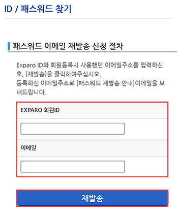 회원 가입 시에 입력하신, ID와 이메일 주소를 입력하시고, “재발행”을 클릭하세요.