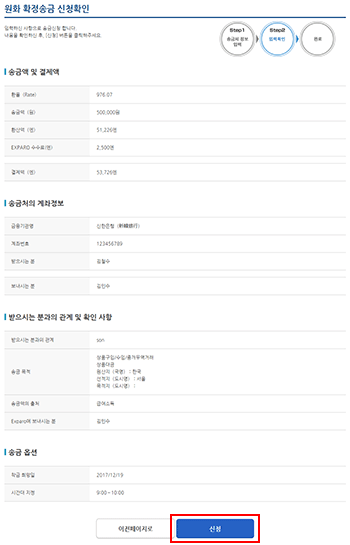 Step3원화 확정 송금신청 내용 확인