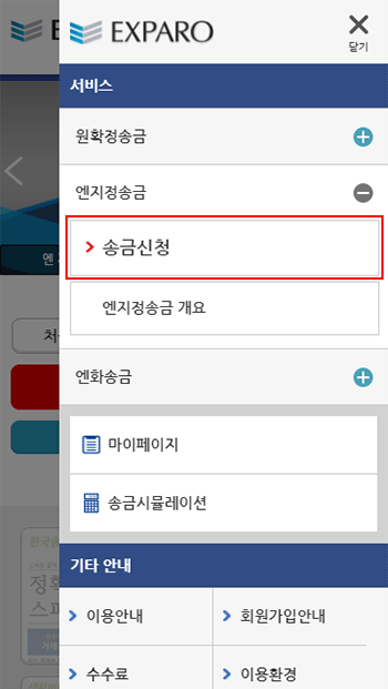 메인페이지 또는 마이페이지 등의 메뉴에서 「엔 지정 송금신청」을 눌러주세요.