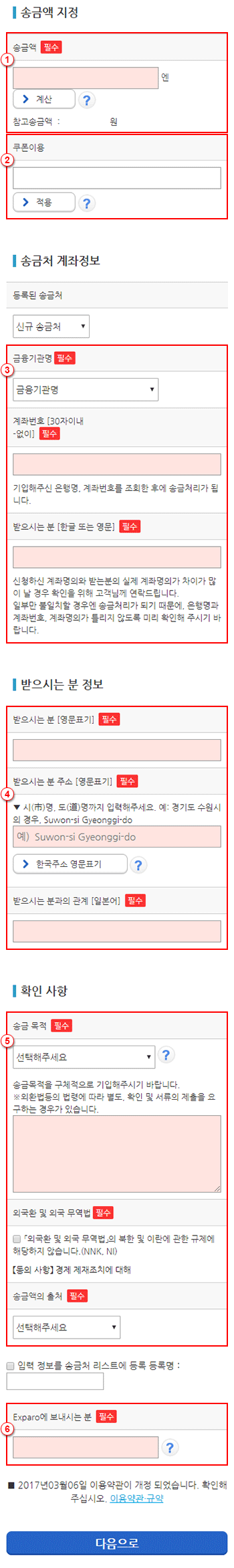 - ※수취국의 정세나 수취은행의 사정등에따라 송금일이 3~5일 정도 늦어지는 경우가 있습니다.