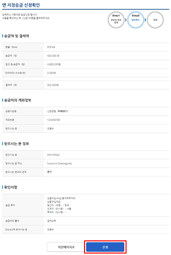 Step3엔 지정 송금신청 내용 확인