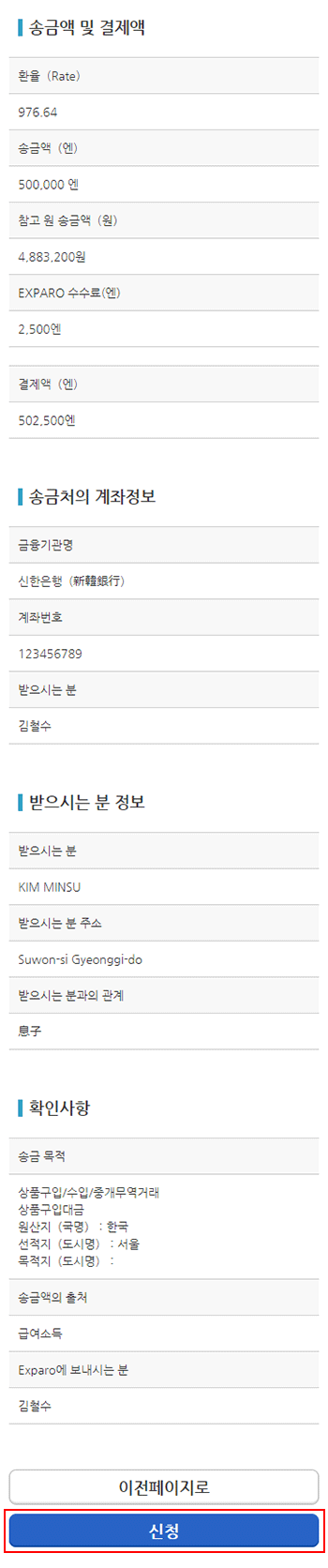 송금신청 내용에 틀림이 없는지 확인해 주시기 바랍니다.
