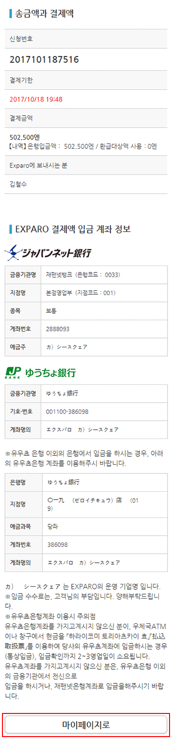 결제기한까지 폐사 지정의 계좌로 결제금액(송금금액+송금 수수료)를 입금해주시기 바랍니다. 입금확인이 되면, 고객님이 등록하신 메일 주소로 입금확인 메일이 자동 송신됩니다. 또는, 마이페이지에서 입금확인 상태를 확인하실 수 있습니다.